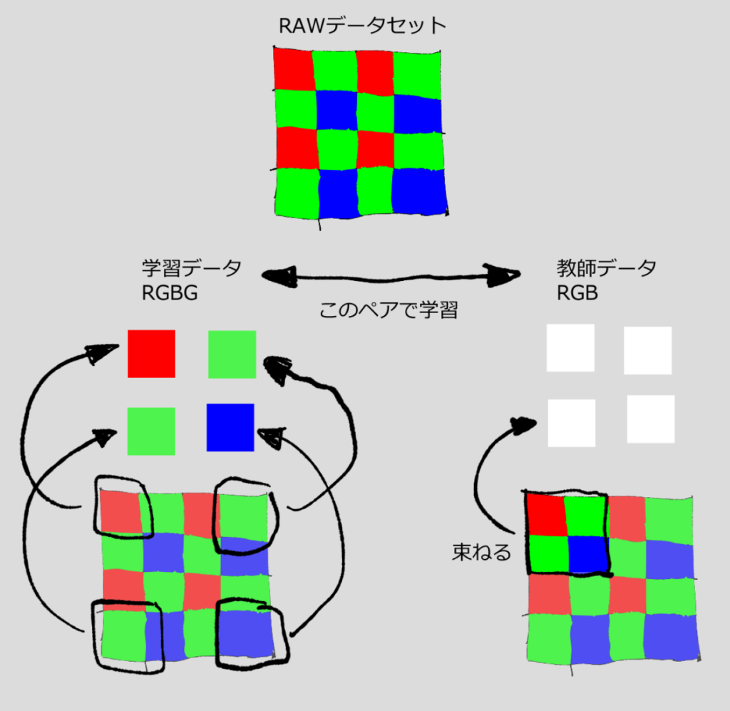 イメージとしては以下のようにしてRAW画像から理想的なペアのデータセットを作り、学習させる。