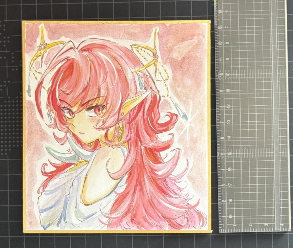 ↓縦13.5cmサイズの色紙です。これはルビーちゃん。水彩メインで、アクリルペン、ラメペン等で仕上げています。